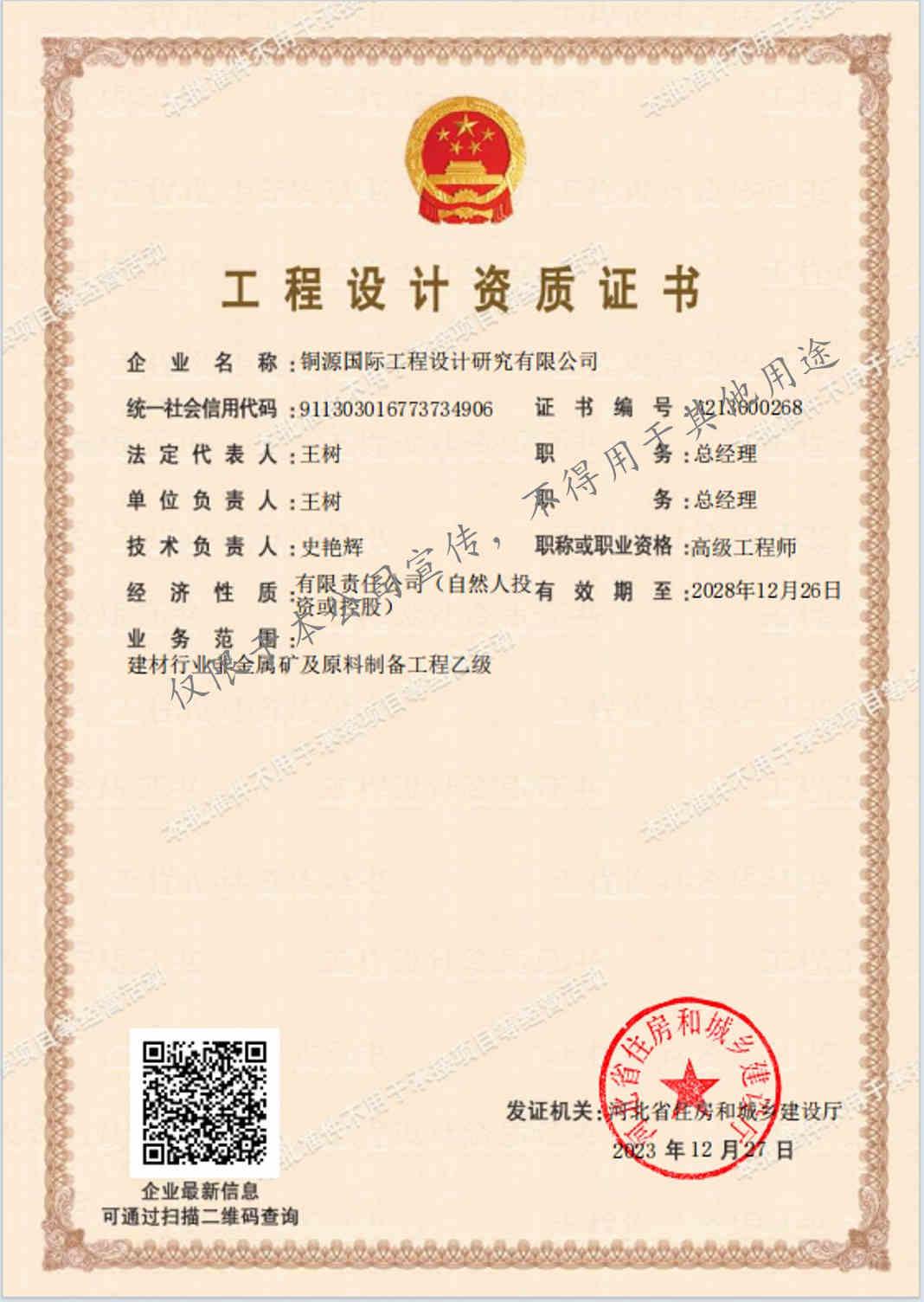 公司持有冶金行业冶金矿山工程甲级设计资质证书和建材非金属矿及原料制备工程乙级设计资质证书。
